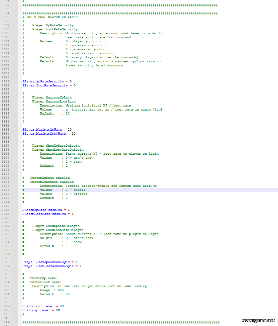 CustomLoot.Level = 80 (вместо 80 поставить 1) CustomXp.Level = 80 (вместо 80 поставить 1) После сохранить внесённые изменения в "worldserver.conf", убедиться, что кодировка файла осталась UTF-8, и перезагрузить сервер.